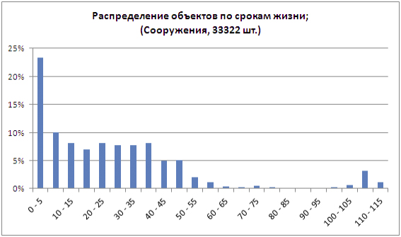 В полученных файлах-подвыборках был рассчитан возраст объекта оценки на дату инвентаризации, соответствующую, по принятому допущению, моменту определения физического износа, отраженного в базе данных. Затем, для получения генерализованного результата, проводилось осреднение определений (значений) физического износа по интервалам в один год. На нижеприведенных гистограммах приведено распределение объектов по срокам фактической жизни (интервал – 5 лет).