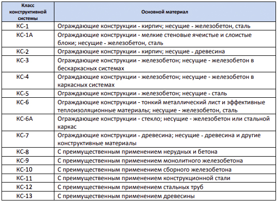Ниже приводится слегка измененная (по структуре) таблица описания конструктивных систем с их кодами, размещаемая в каждом издании Справочника (например: в разделе «Информационная основа и принципы построения изданий КО-ИНВЕСТ серии «Справочник оценщика», «Общественные здания» — 2014; с.15.)